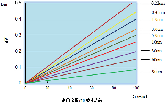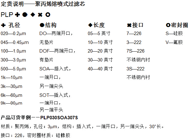 该滤芯为深层型过滤,滤芯由外向内,聚丙烯纤维直径由粗到细,过滤孔径由大到小逐渐变化。滤芯内侧的孔径决定了滤芯的过滤精度,滤芯的外侧起到了预过滤的作用,因此该种滤芯是预过滤和终过滤的合二为一。